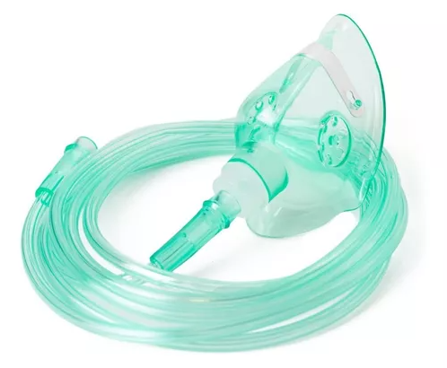 Mascarilla desechable para administración de oxígeno adulto con tubo de conexión de 180 cm y adaptador.