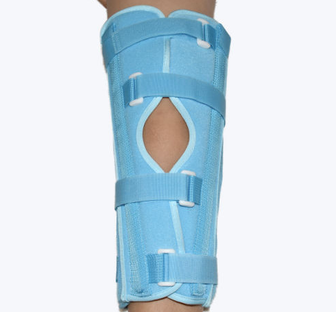 Inmovilizador de rodilla, contiene paneles laterales ajustables a diferentes anchos de la pierna, contiene 2 varillas rígidas laterales y mediales para incrementar la estabilidad.